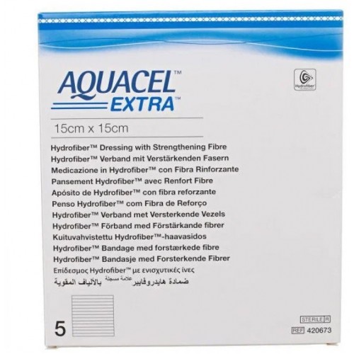 Aquacel Extra 15x15 см стерильная абсорбирующая повязка, выполненная по технологии Гидрофайбер из двух скрепленных слоев натрий карбоксиметилцеллюлозы, дополнительно прошитых усиленным волокном регенерируемой целлюлозы для обеспечения прочности.